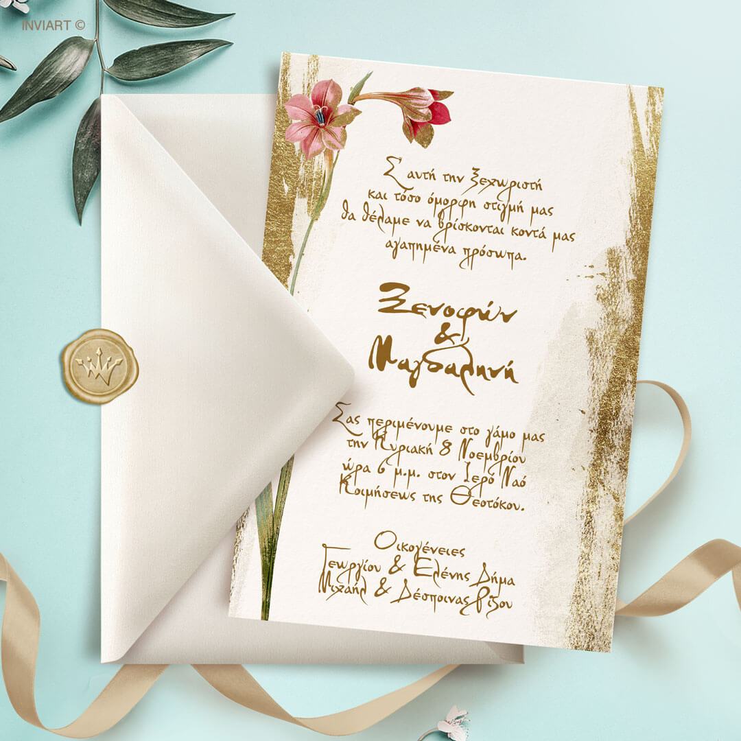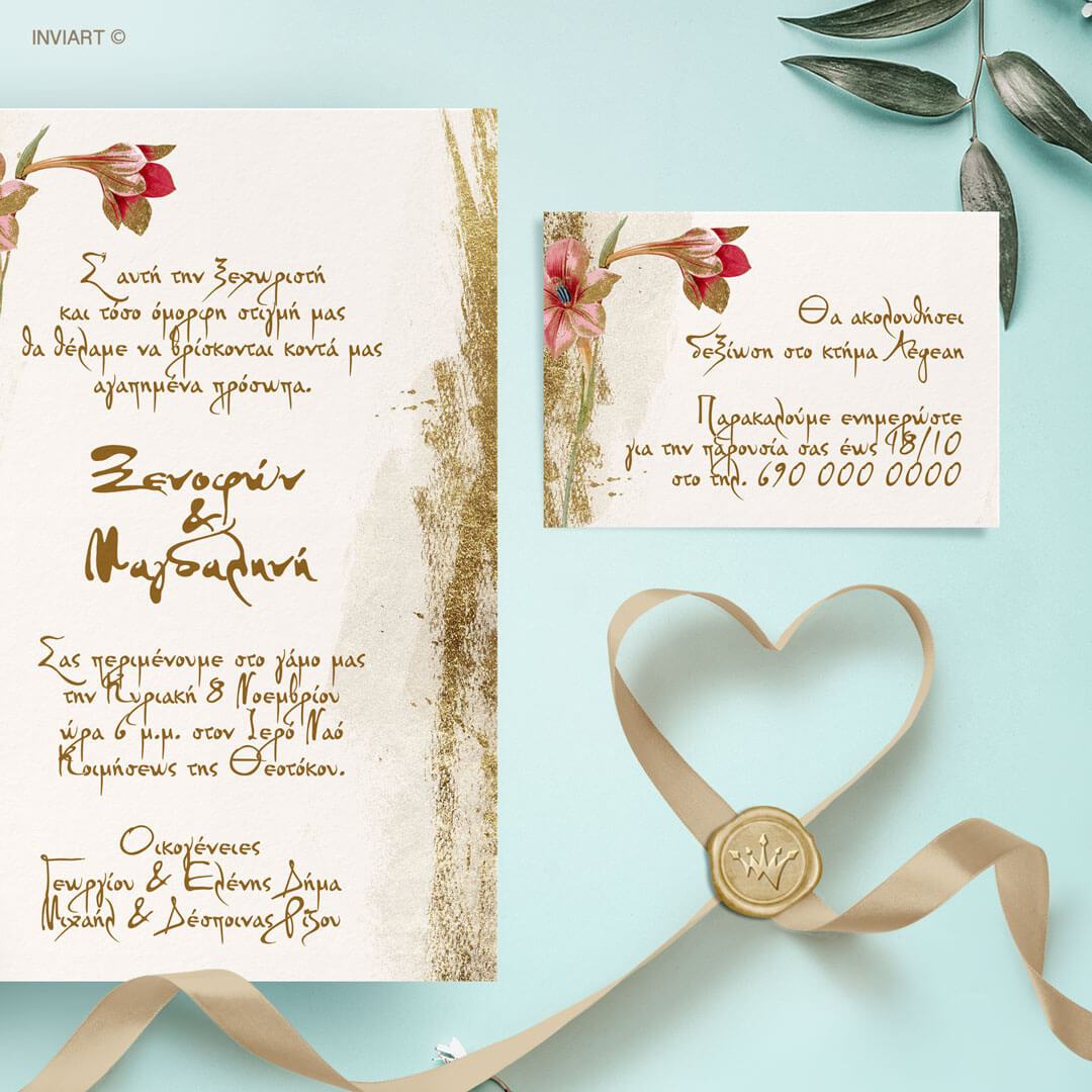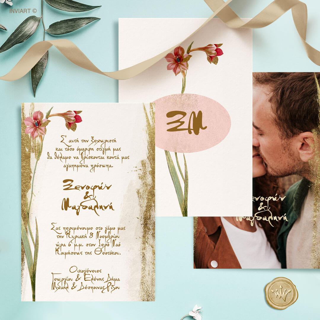 προσκλητήριο γάμου watercolour χρυσό με λουλούδι