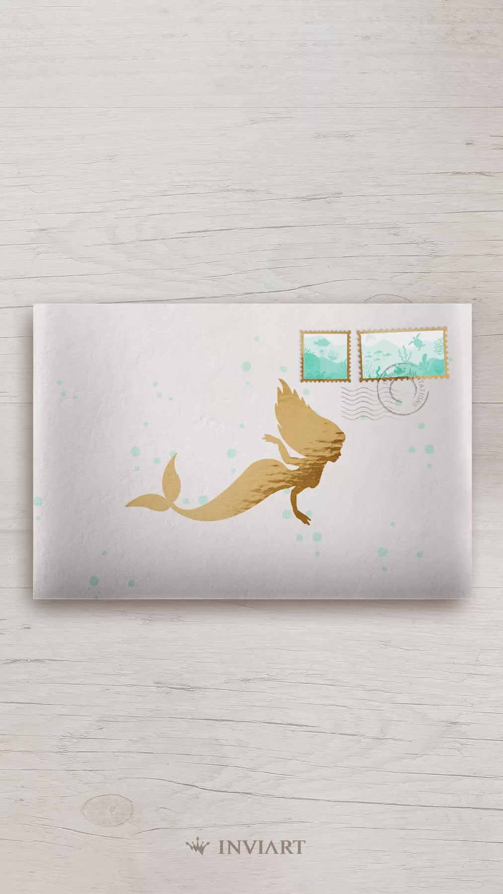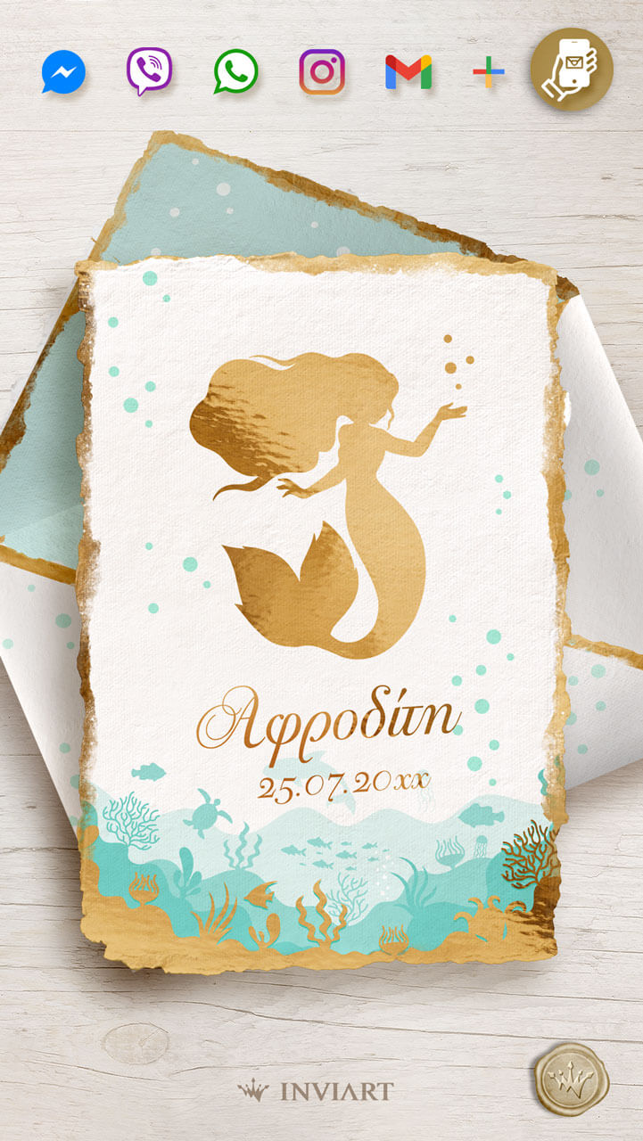 Ηλεκτρονικό Προσκλητήριο Βάπτισης Γοργόνα – Θέμα Βυθός με Χρυσή Σιλουέτα & Τυρκουάζ Coral