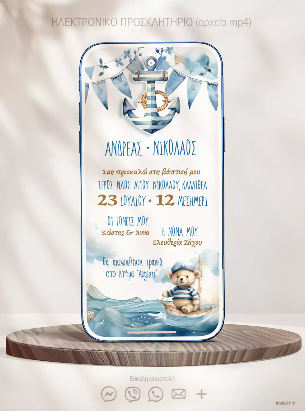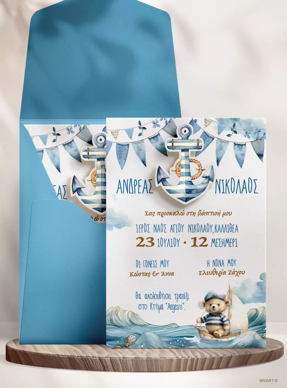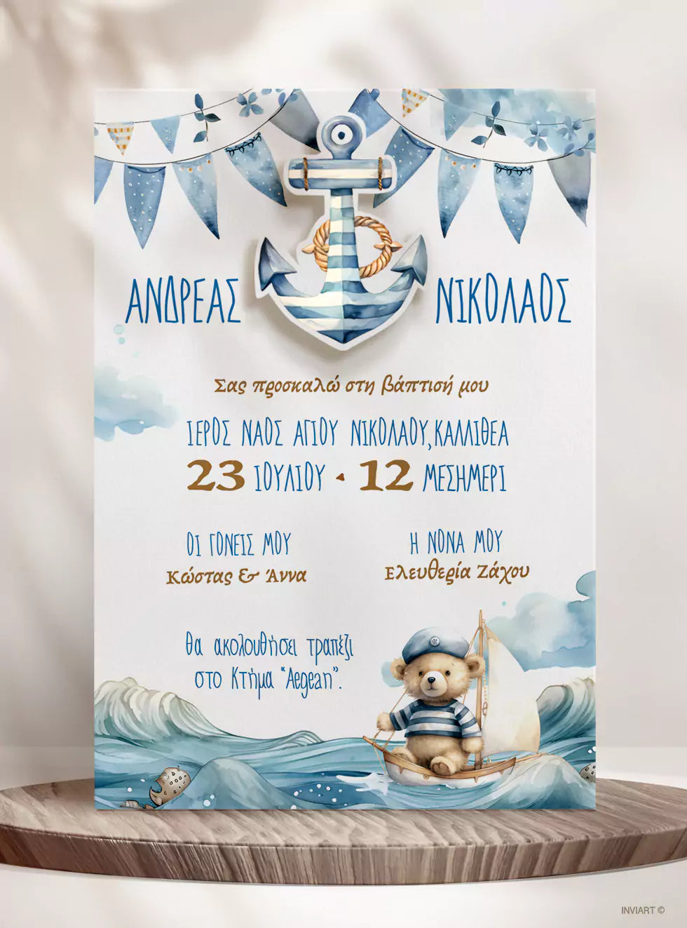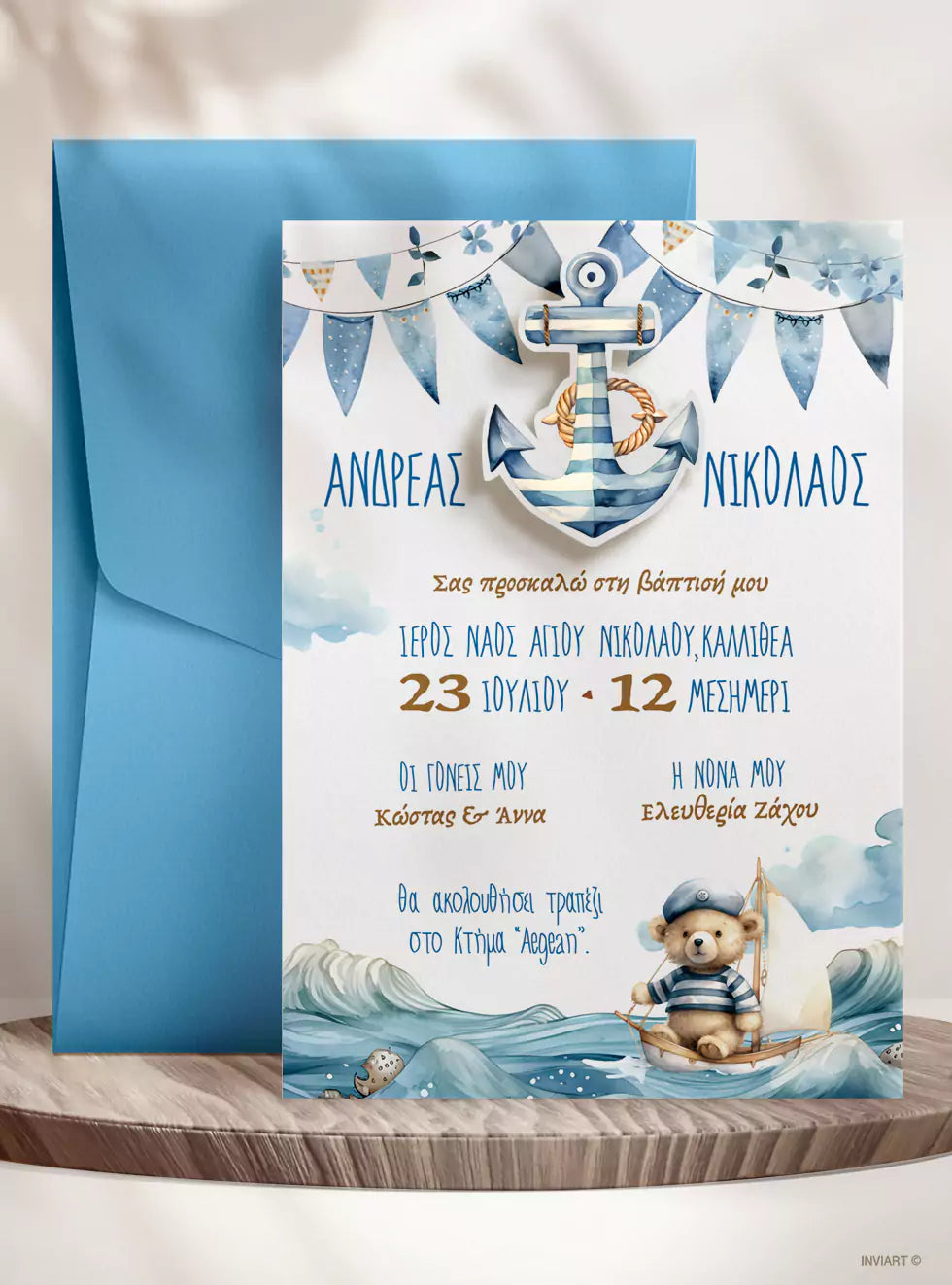 Προσκλητήριο Βάπτισης Άγκυρα & Αρκουδάκι – Ναυτικό Θέμα για Αγόρι ⚓