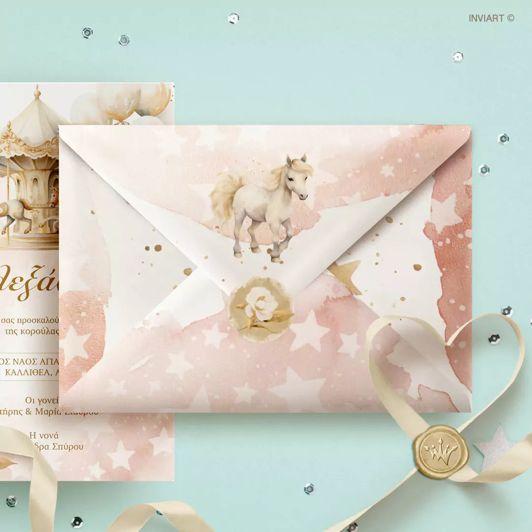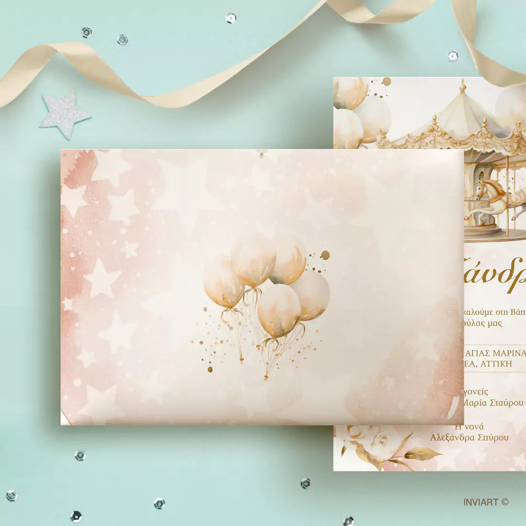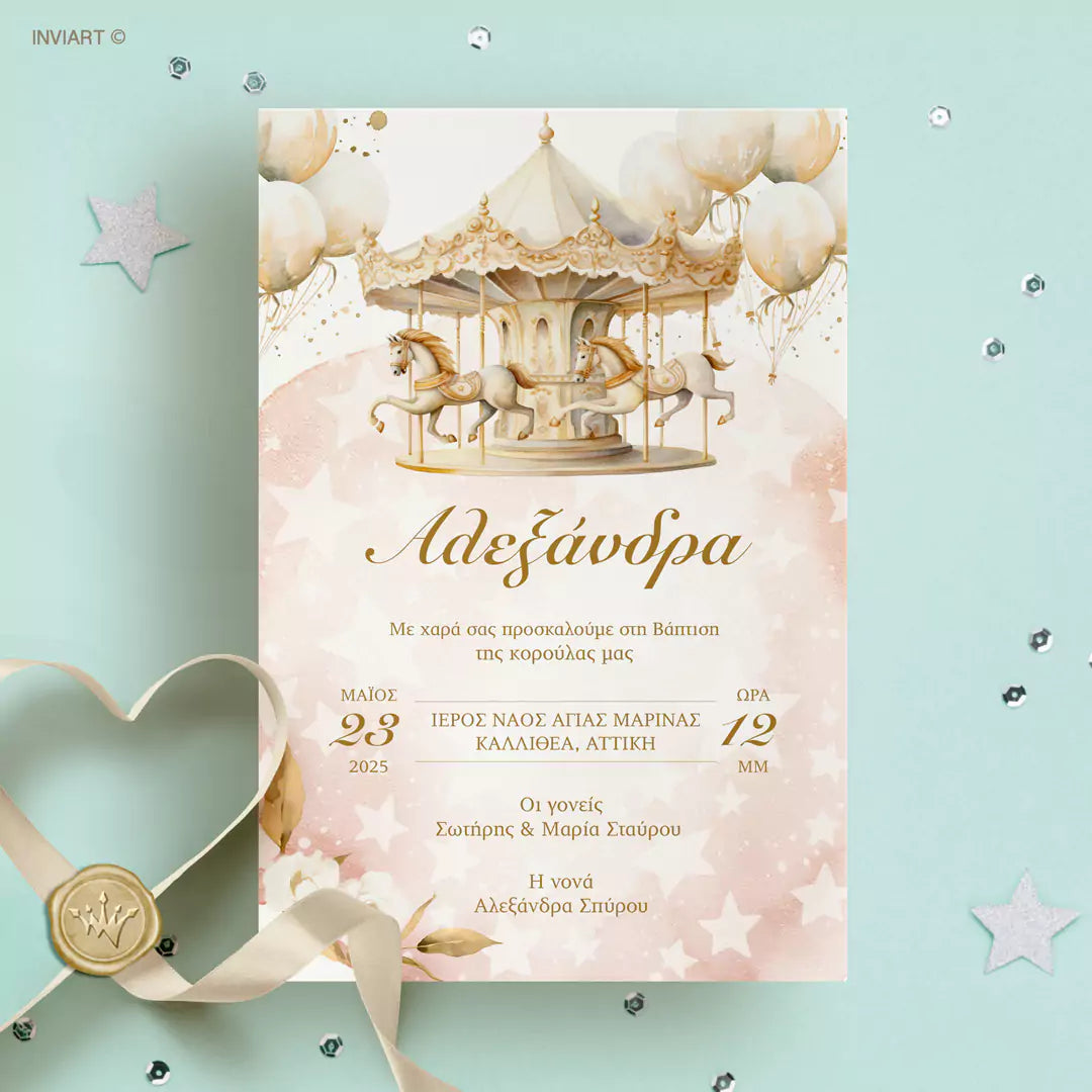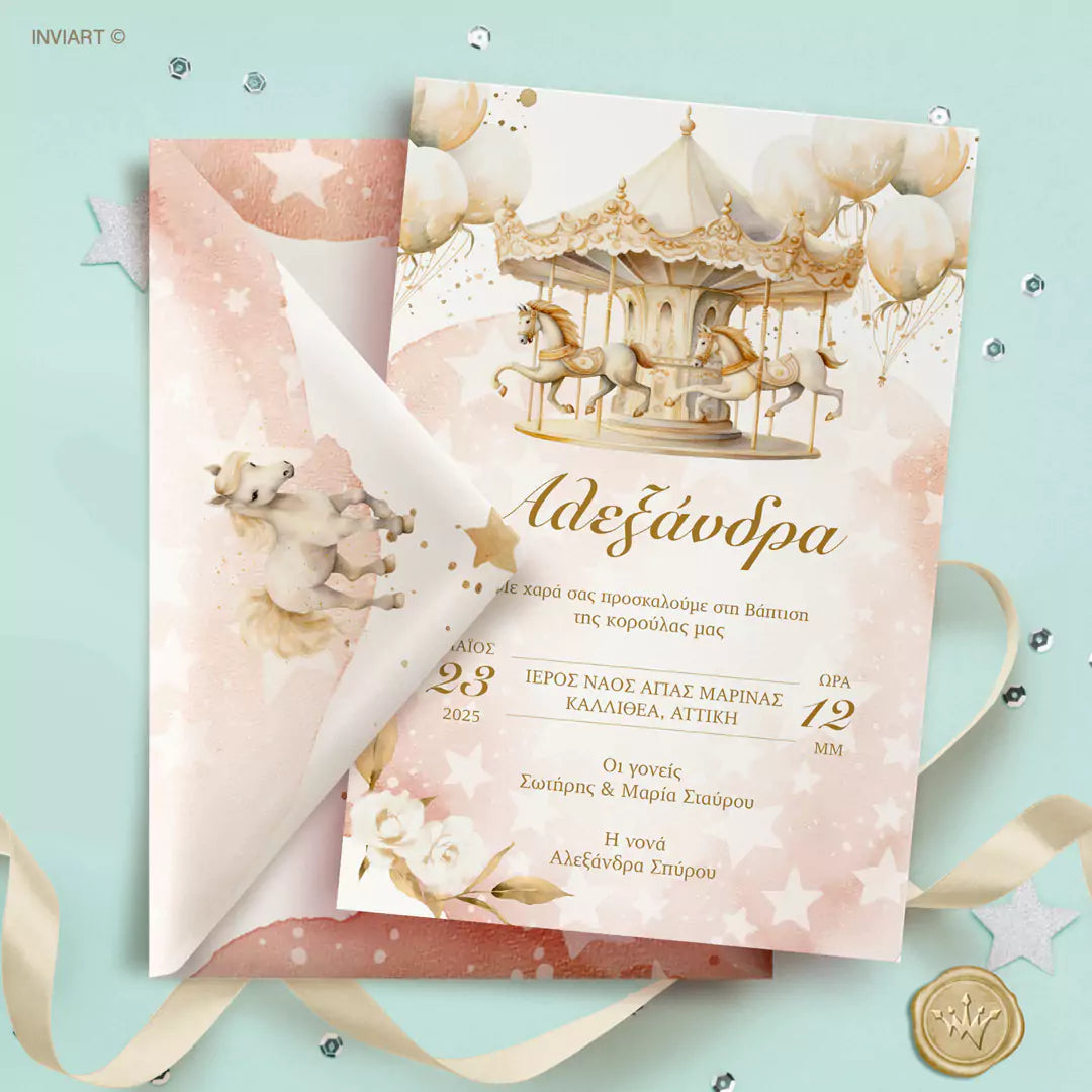 Προσκλητήριο Βάπτισης Καρουζέλ για Κορίτσι - Ροζ & Χρυσό με Φάκελο