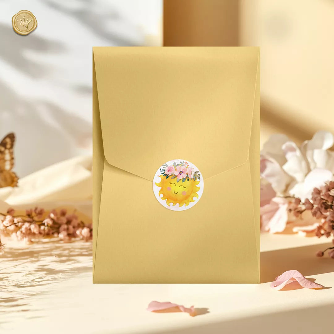 Ένα φωτεινό, χαρούμενο προσκλητήριο που φέρνει την αίσθηση του καλοκαιριού από την πρώτη ματιά. Ο χαμογελαστός ήλιος στο κέντρο, στεφανωμένος με απαλά ροζ λουλούδια, δένει αρμονικά με τις ανθισμένες συνθέσεις στα άκρα και τις χρυσές πινελιές του πλαισίου. Η εικονογράφηση σε ακουαρέλα κρατά το αποτέλεσμα απαλό και κοριτσίστικο, χωρίς υπερβολές.