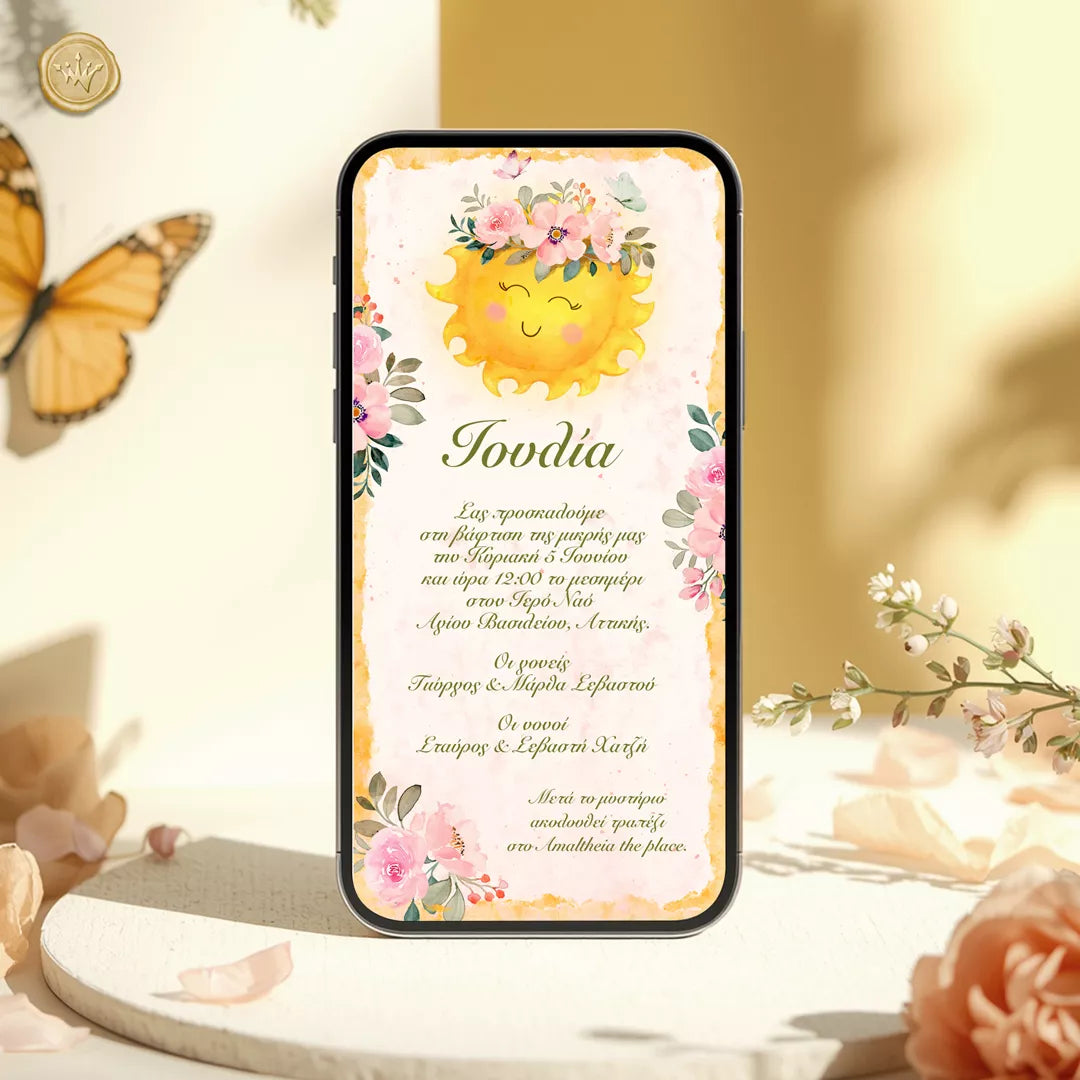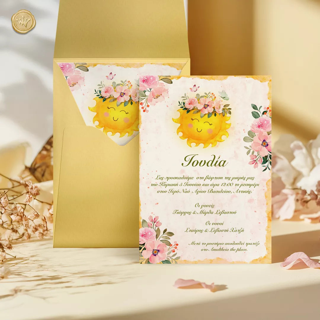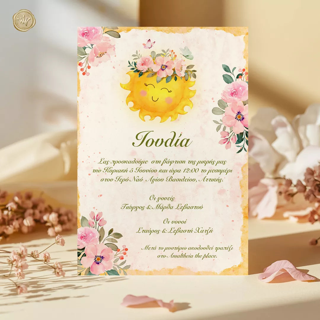 Προσκλητήριο βάπτισης ήλιος με λουλούδια για κορίτσι