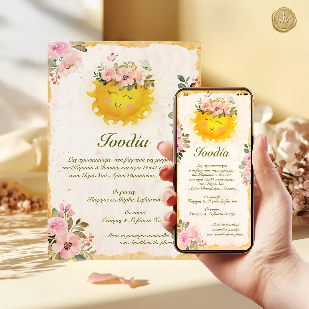 Χάρισε στη βάπτιση της μικρής σου μια φωτεινή αρχή με τον ήλιο και τα λουλούδια. Ένα προσκλητήριο χαρούμενο, κομψό και πραγματικά ξεχωριστό—επίλεξέ το και το προσαρμόζουμε στα στοιχεία σας.