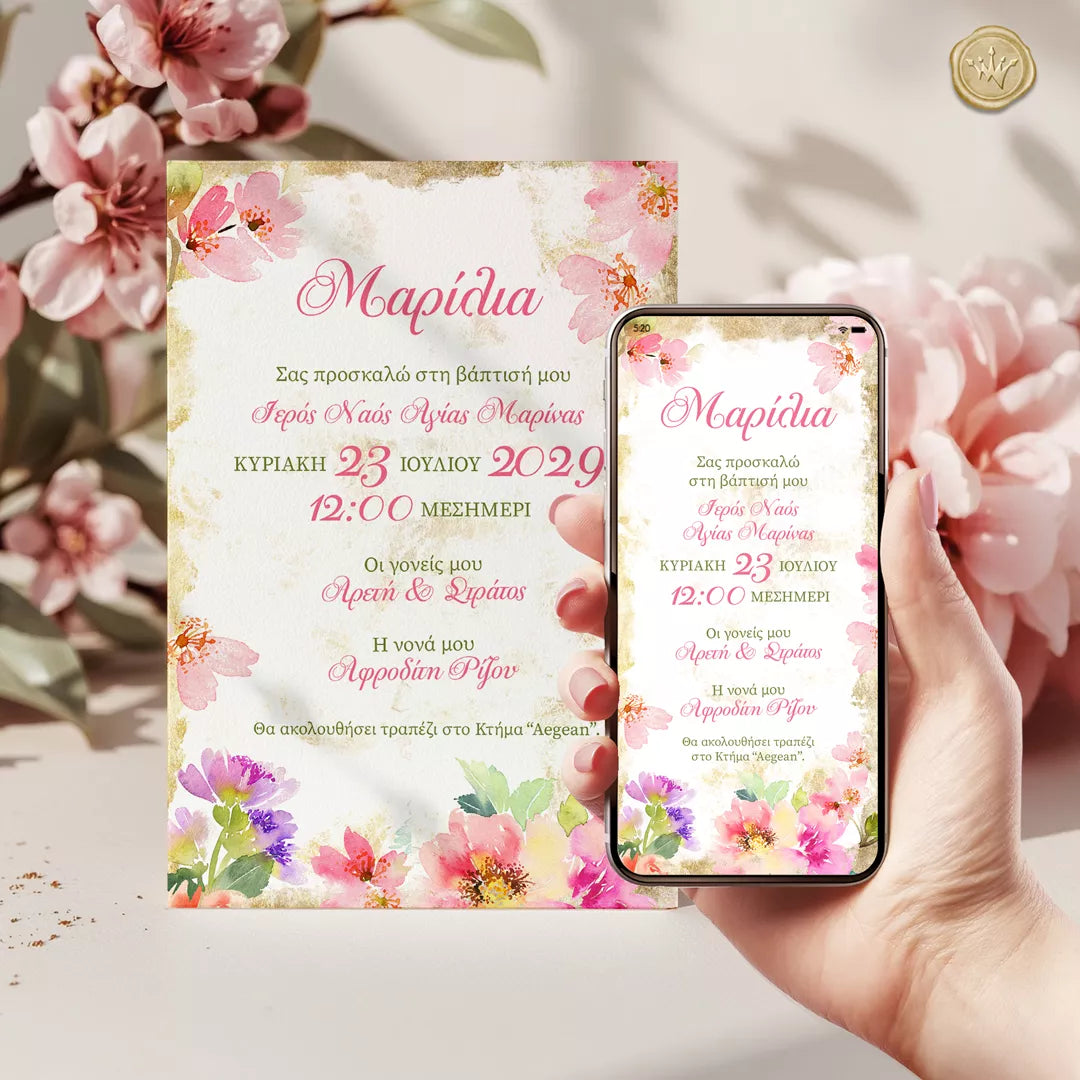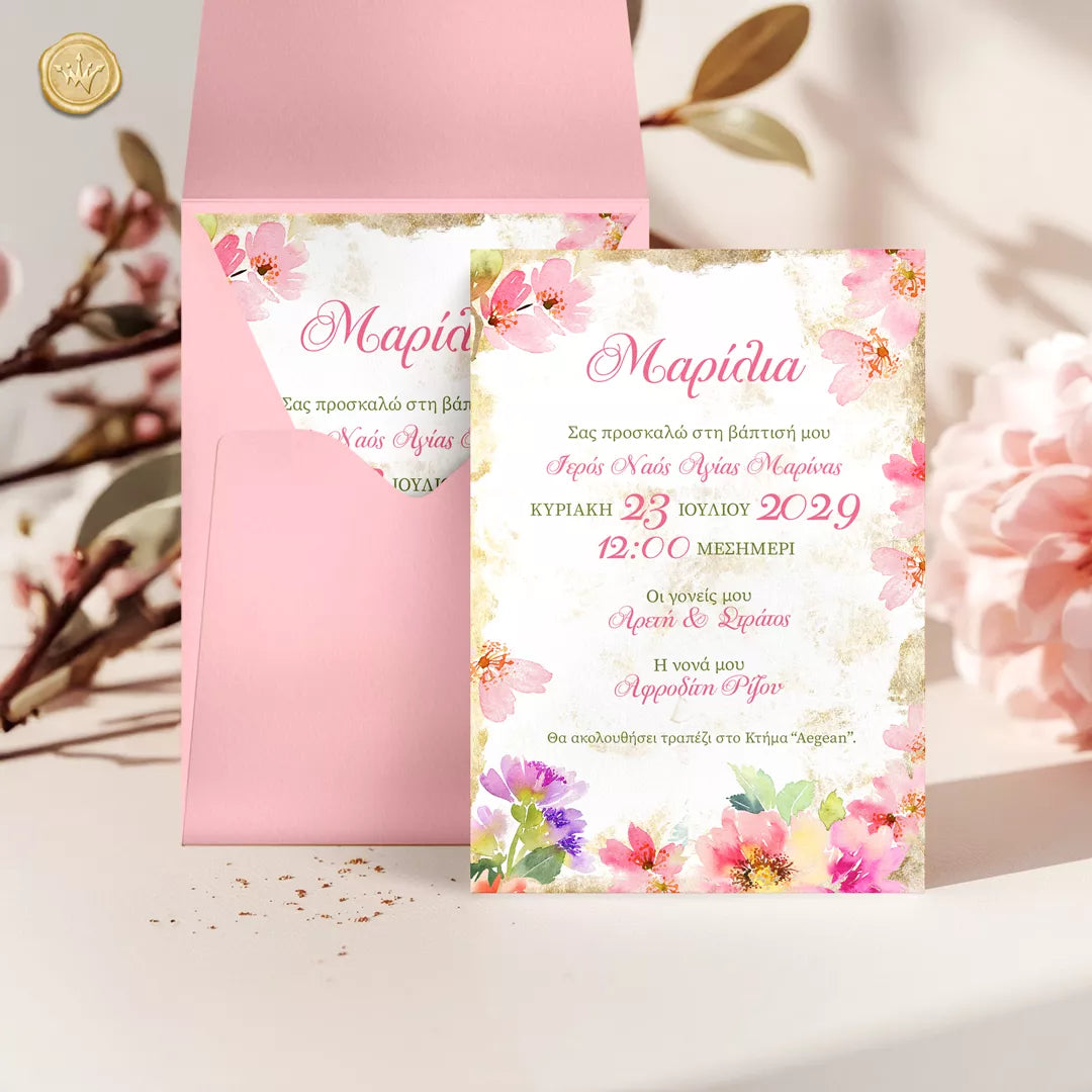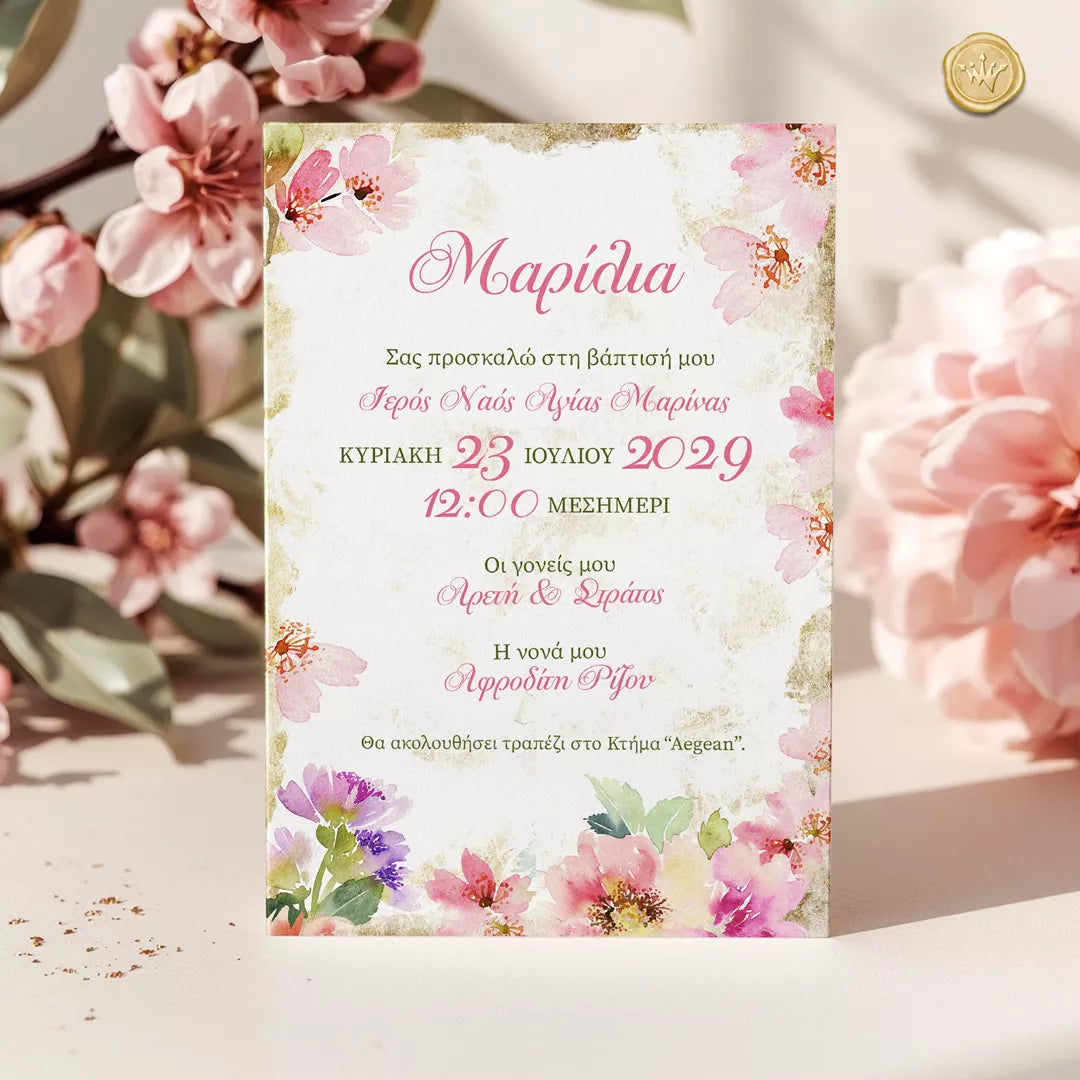 Ανθισμένα ροζ λουλούδια αγκαλιάζουν διακριτικά το προσκλητήριο, δημιουργώντας ένα κομψό ανοιξιάτικο πλαίσιο. Οι απαλές αποχρώσεις ροζ, φούξια και πράσινου σε τεχνοτροπία ακουαρέλας χαρίζουν φυσικότητα και φως στο σύνολο.