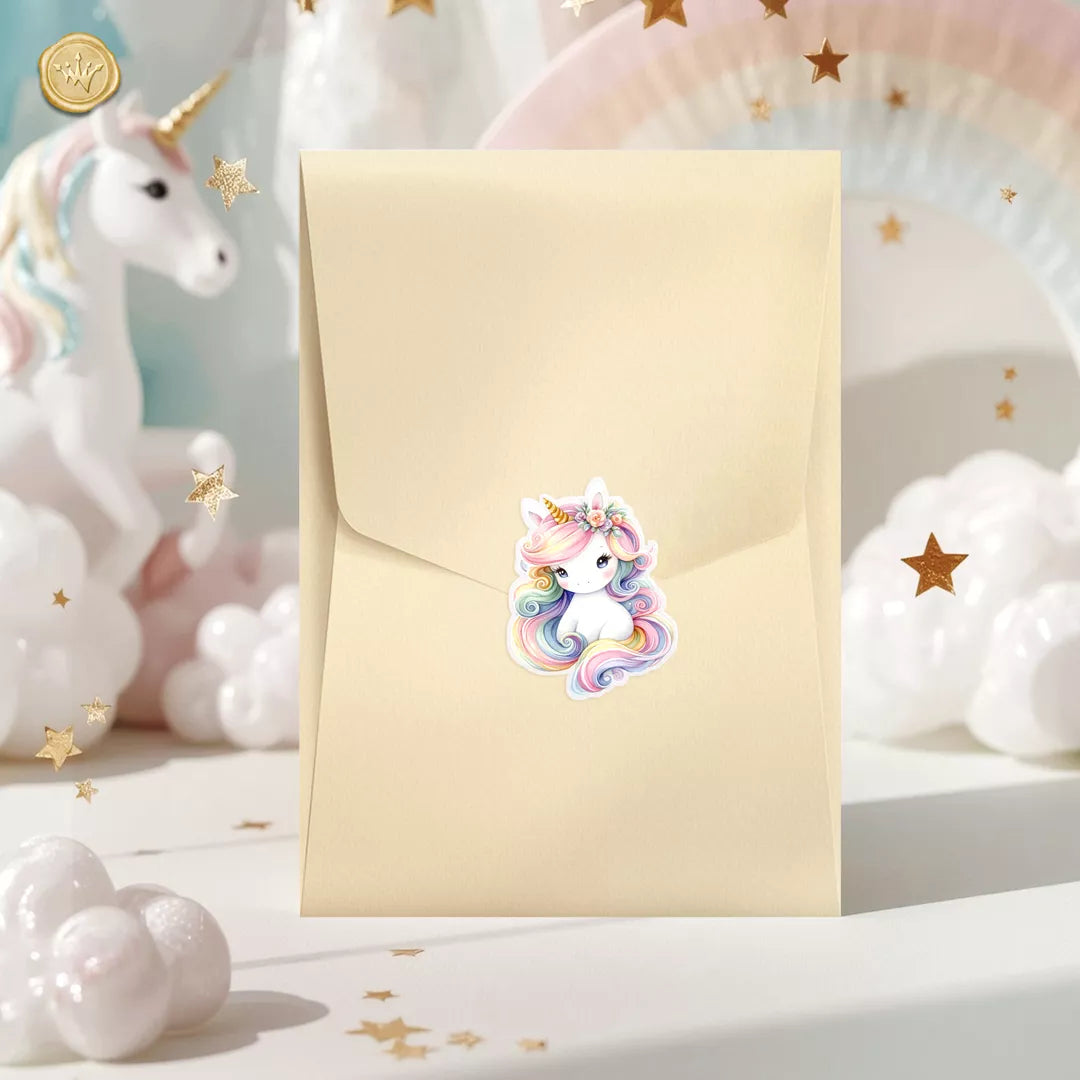 Ένας γλυκός μονόκερος που κοιμάται πάνω σε σύννεφα, αγκαλιά με ουράνιο τόξο, αστερόσκονη και χρυσές λεπτομέρειες που φωτίζουν διακριτικά το σχέδιο.