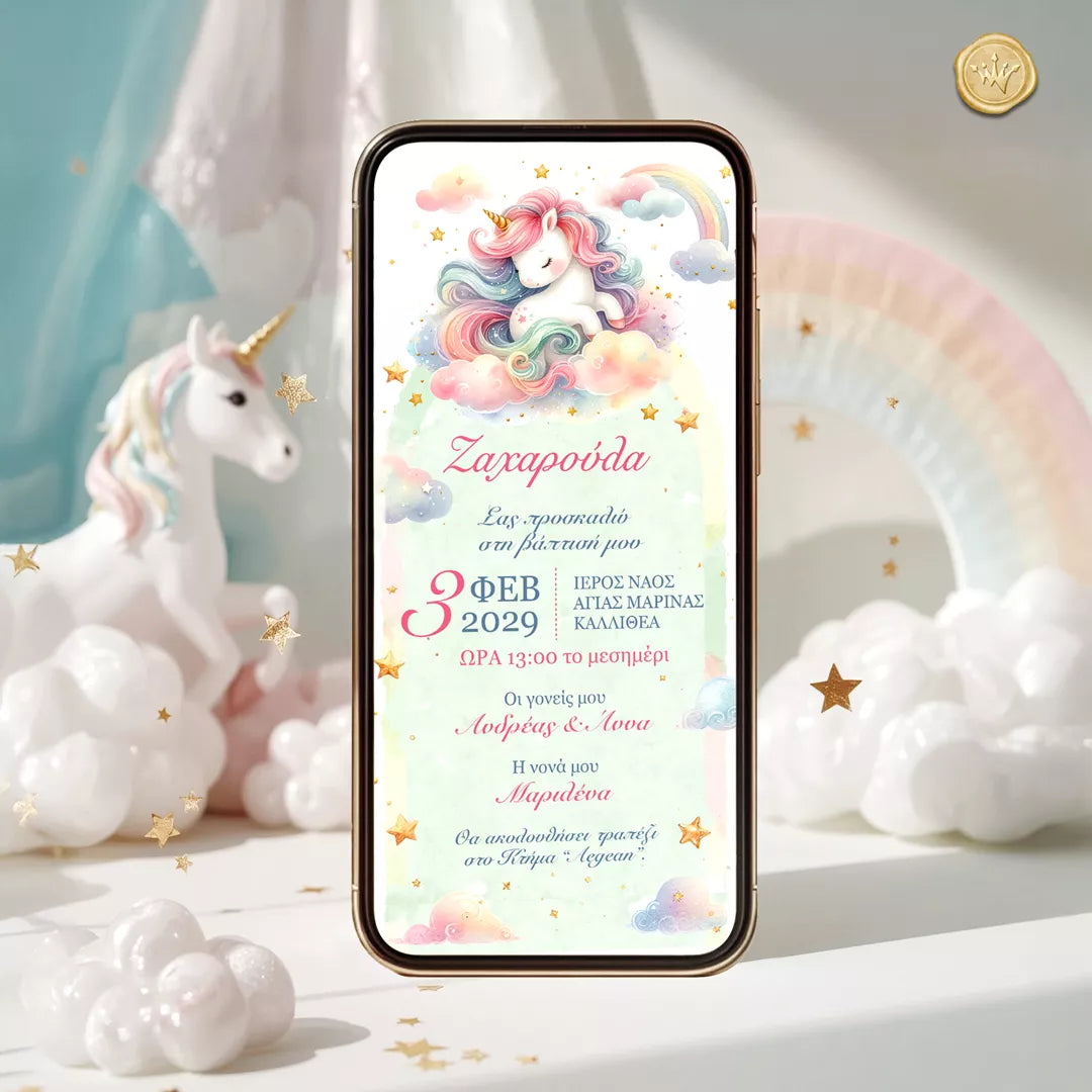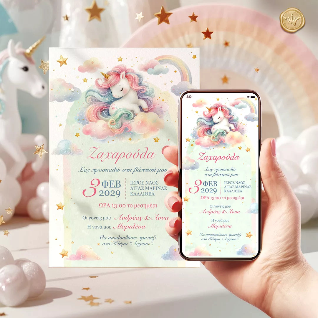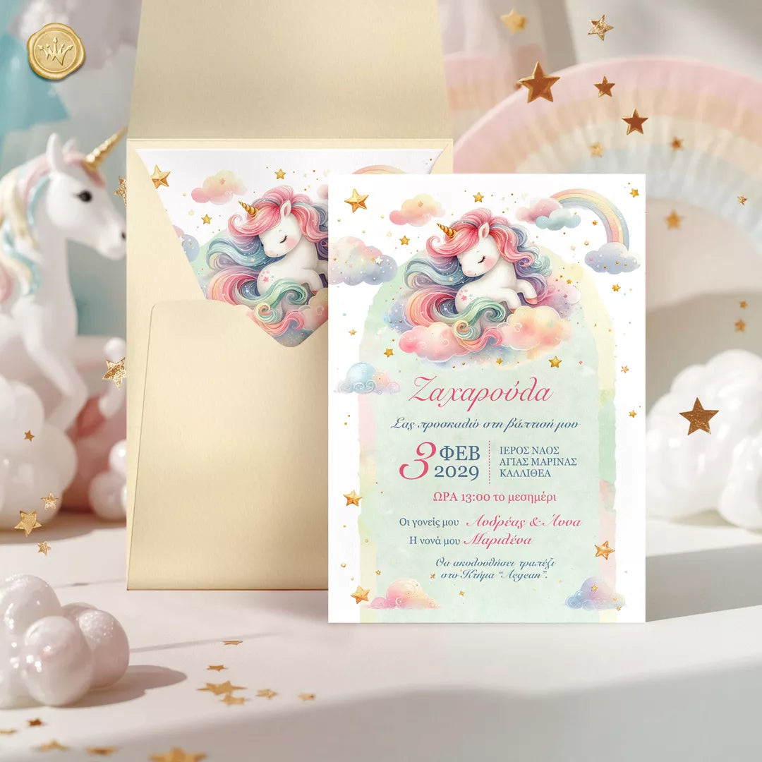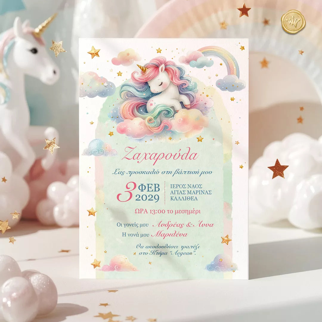 Προσκλητήριο βάπτισης μονόκερος για κορίτσι σε παστέλ αποχρώσεις