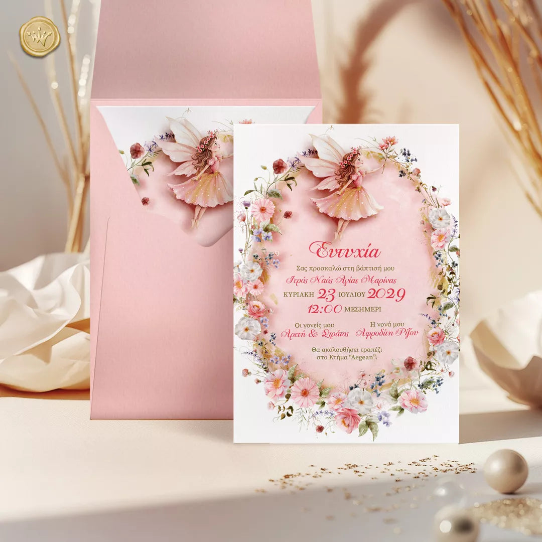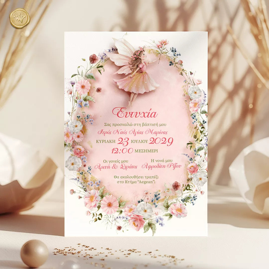 Ένα παραμυθένιο προσκλητήριο βάπτισης με νεράιδα για κορίτσι που μοιάζει να ξεπήδησε από σελίδες παιδικού βιβλίου. Η νεράιδα με τα απαλά φτερά στέκεται στο κέντρο ενός λουλουδένιου στεφανιού, μέσα σε παστέλ ροζ φόντο με λεπτομέρειες που θυμίζουν ακουαρέλα και διακριτική χρυσή λάμψη.