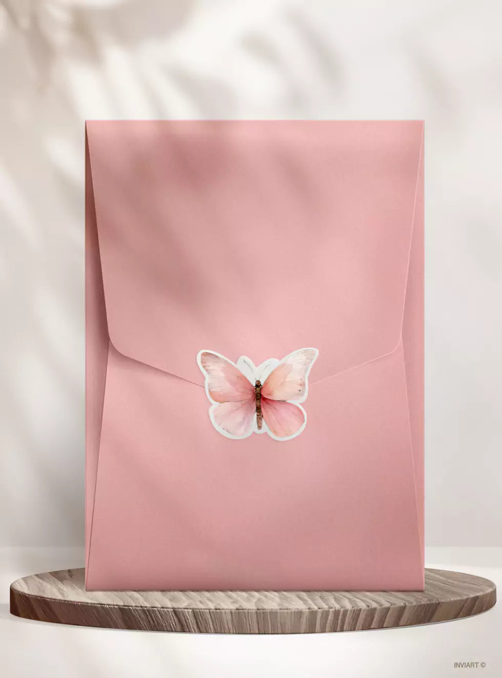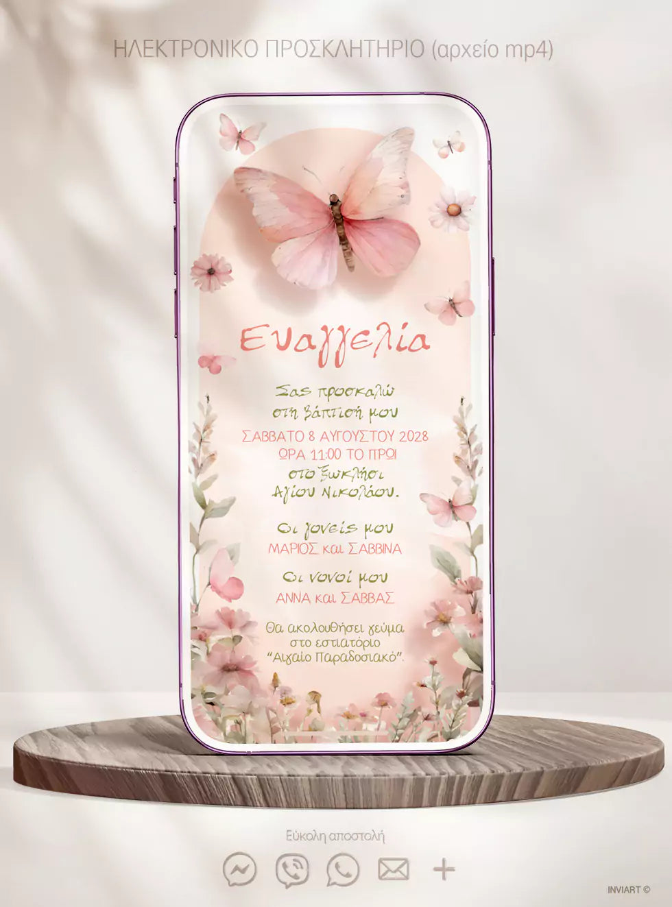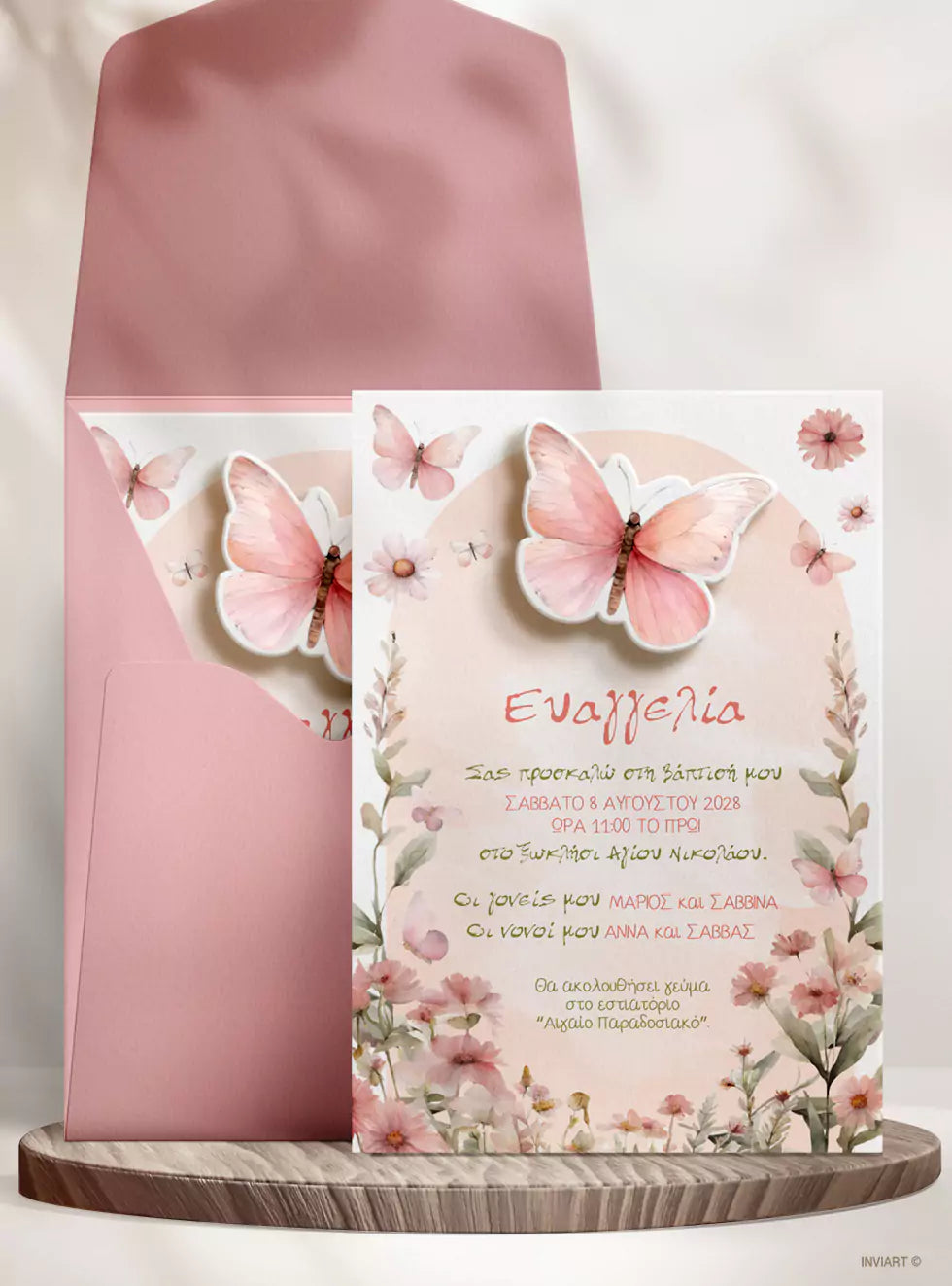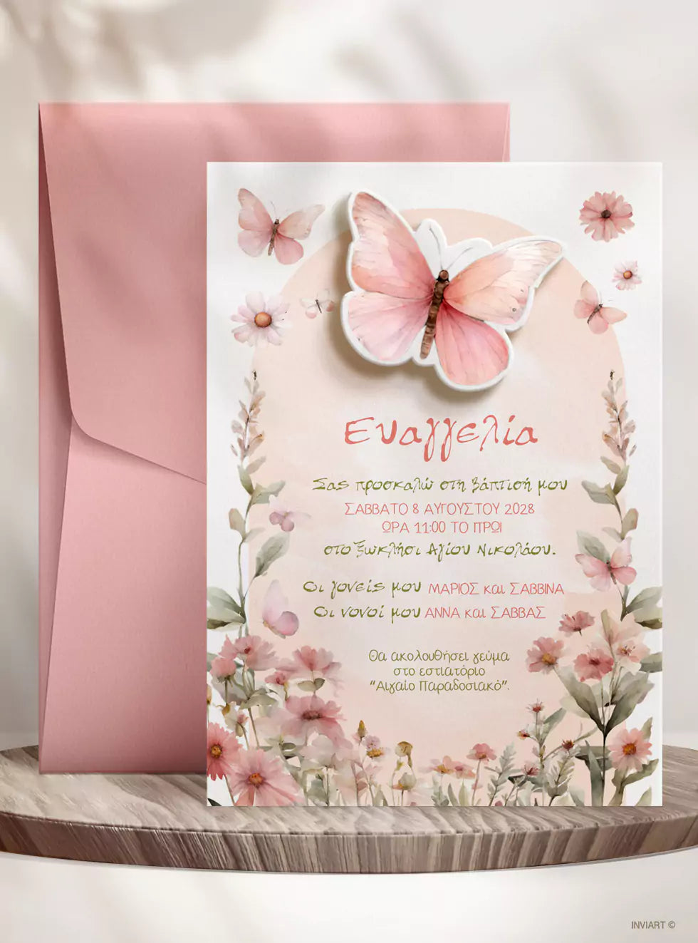 Πρόσκληση Βάπτισης Πεταλούδα με Λουλούδια – Ροζ & Πράσινο